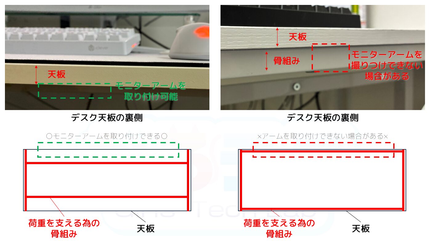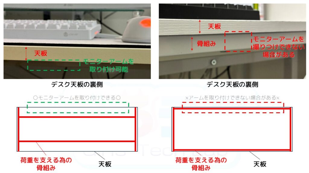 具体的にモニターアームを取り付けできる天板とできない天板の形状の違いは下記の画像の通り。