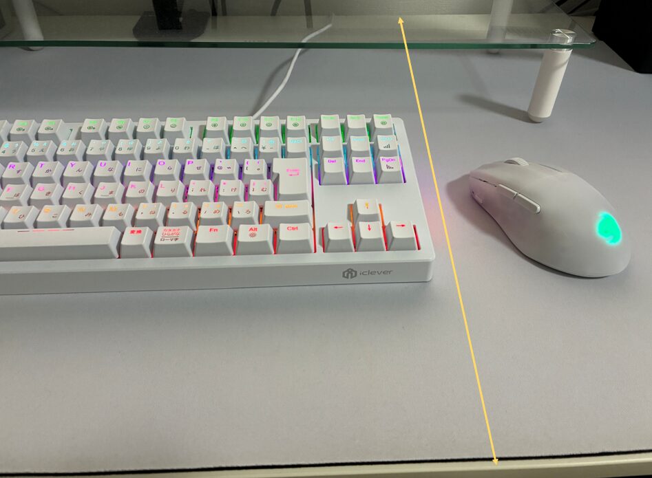 デスク幅に関連して奥行きについても気にしておきたいポイント。インテリアとして販売されているデスクの多くは奥行きが45cm程度しかないことも少なくありません。ゲーミングモニターのスタンドはがっちりとした安定感のある大きな台座であることもあり、ゲーミングマウスを十分に動かせる面積を確保しようとなると、60cm以上の奥行きのデスクを探すのが賢明です。最近は70cmの奥行きの大型デスクも多いので、デスクの上に置きたいものを考えてみて、ゆとりのある奥行きを選びましょう。